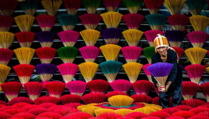 Pour ce deuxième jour à Hué dans l'itinéraire Hué 48 heures, j’ai quitté la ville pour explorer les villages artisanaux traditionnels. Accompagné d’un guide local, j’ai visité le village de Thuy Xuan, célèbre depuis 700 ans pour la fabrication des bâtons d’encens, autrefois destinés à la cour royale. Malgré les bouleversements historiques, ce savoir-faire est toujours vivant. Les allées bordées d’encens coloré séchant au soleil offrent un spectacle fascinant. J’ai observé les artisans à l’œuvre et même essayé de fabriquer un bâton. L’encens d’agarwood coûte entre 80 000 et 200 000 VND (3.5 - 9 euros) par paquet, tandis que l’encens de cannelle est à 40 000 VND 2 euros). À ce village, ne manquez pas les magnifiques faisceaux d’encens en arrière-plan et l’atelier de fabrication pour une expérience authentique.