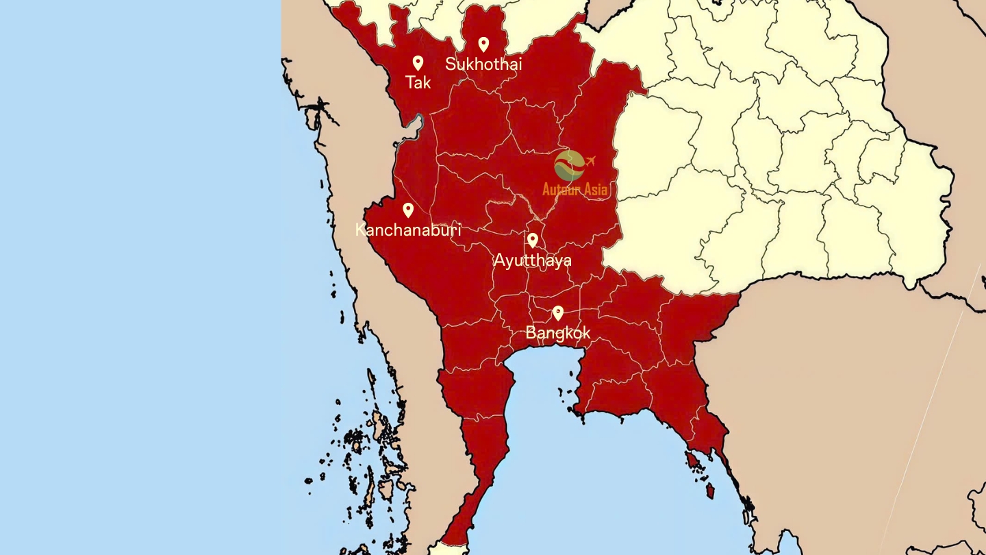 Le Centre correspond à une vaste plaine alluviale nourrie par les grands fleuves. La carte touristique Thaïlande met en valeur Bangkok puis Ayutthaya, cœur historique lié au riz puis aux anciennes capitales royales.