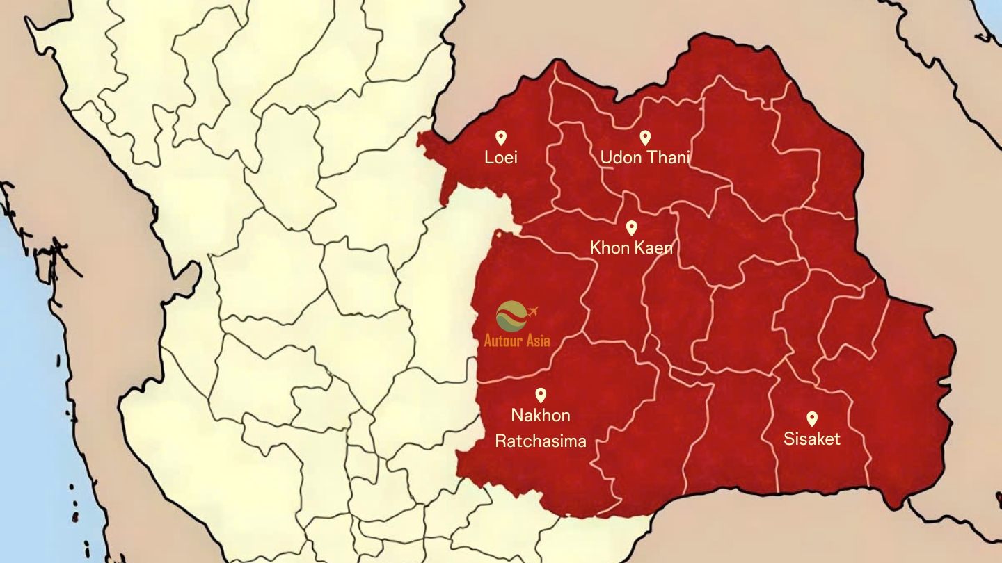 Sur une carte voyage Thaïlande, l’Isan occupe la vaste région du Nord Est, moins fréquentée, profondément ancrée dans la culture locale. Cette zone se caractérise par des plateaux étendus, un climat plus sec, un mode de vie rural préservé. La carte touristique Thaïlande met en lumière des villes comme Udon Thani, Khon Kaen, Nakhon Ratchasima, connues pour leurs marchés traditionnels, leurs festivals régionaux, leur gastronomie typique.