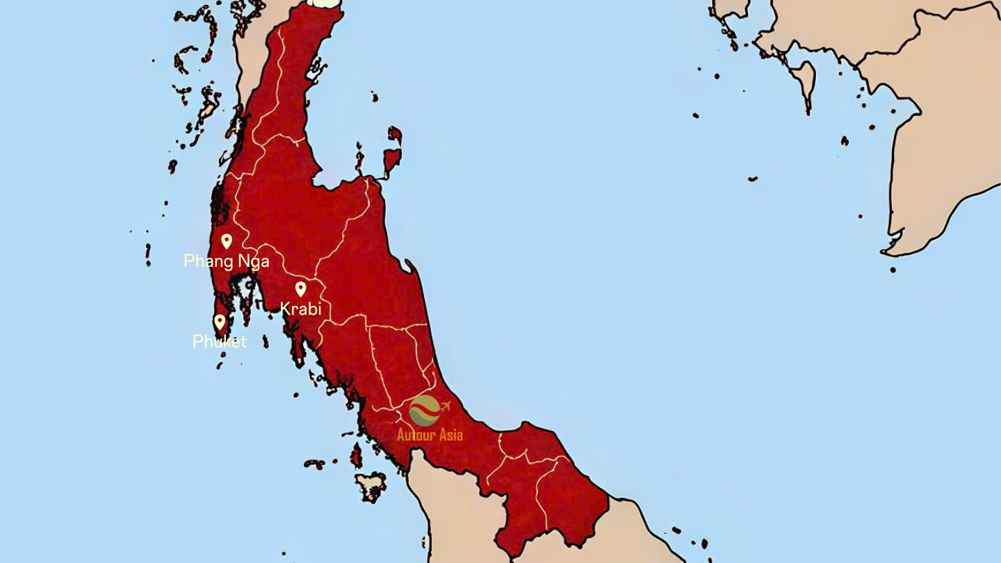 La côte Andaman figure à l’Ouest sur la carte voyage Thaïlande. Phuket, Krabi séduisent par une ambiance animée, des formations calcaires impressionnantes, des plages populaires auprès d’un public actif.