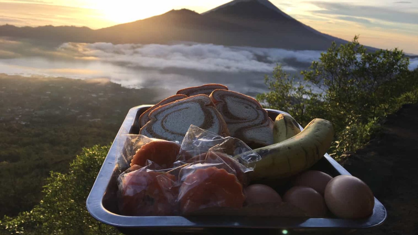 À 06h30, une pause bienvenue attend les randonneurs au sommet : des œufs et des bananes cuits à même les fissures volcaniques, grâce à la chaleur naturelle qui s'en échappe. Ce petit-déjeuner improvisé sur le cratère est devenu une tradition incontournable du 1 jour trekking au Mont Batur, et un souvenir que peu de voyageurs oublient facilement.