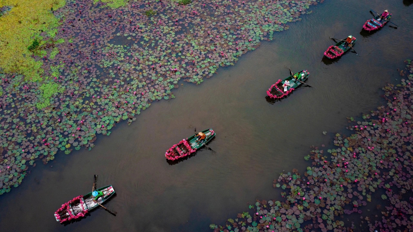 Avant de plonger dans le détail de mon excursion 2 jours à Tam Coc, parlons un peu de ce qui rend ma visite Tam Coc en automne si spéciale. Ce n’est pas les rizières, mais la saison des nénuphars, qui s’étend de fin septembre à début décembre. Les rivières de Tam Coc, Trang An et Thung Nham se couvrent alors de fleurs roses et violettes, créant un paysage romantique et très photogénique. J’adore cette ambiance douce et colorée : pagayer au milieu des fleurs donne une sensation unique. Même sans les champs dorés, l’automne dévoile une beauté silencieuse et envoûtante.