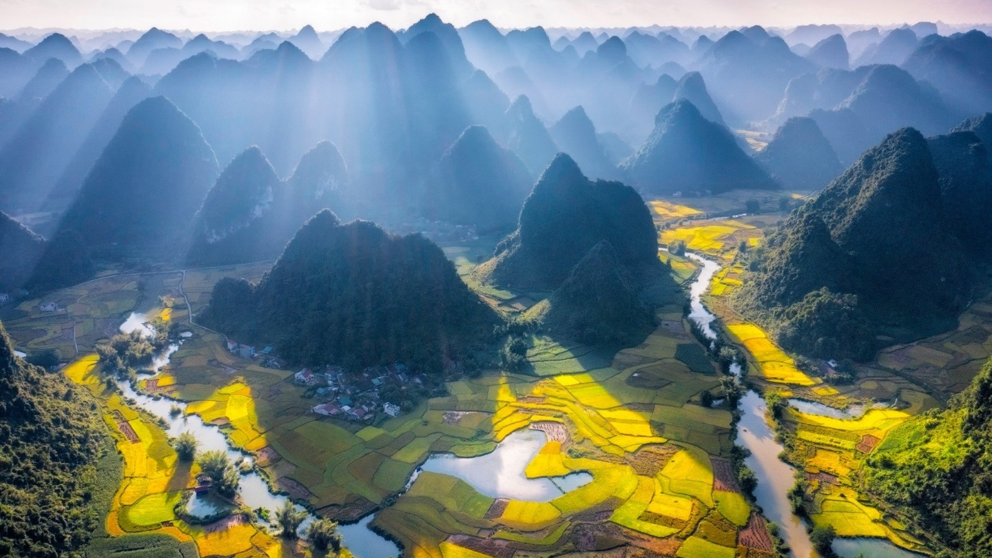 À cette période, les vallées de Phong Nam hay Ngoc Con ne sont plus seulement des paysages, elles deviennent des œuvres d'art vivantes. Les rizières en terrasses se transforment en un tapis de soie jaune ondulant à l'infini au pied des majestueuses montagnes de calcaire. L'air frais du matin s'emplit du parfum doux et entêtant du riz mûr, tandis que vous pouvez observer les paysans locaux s'affairer joyeusement pour la récolte, offrant des scènes de vie authentiques et touchantes.