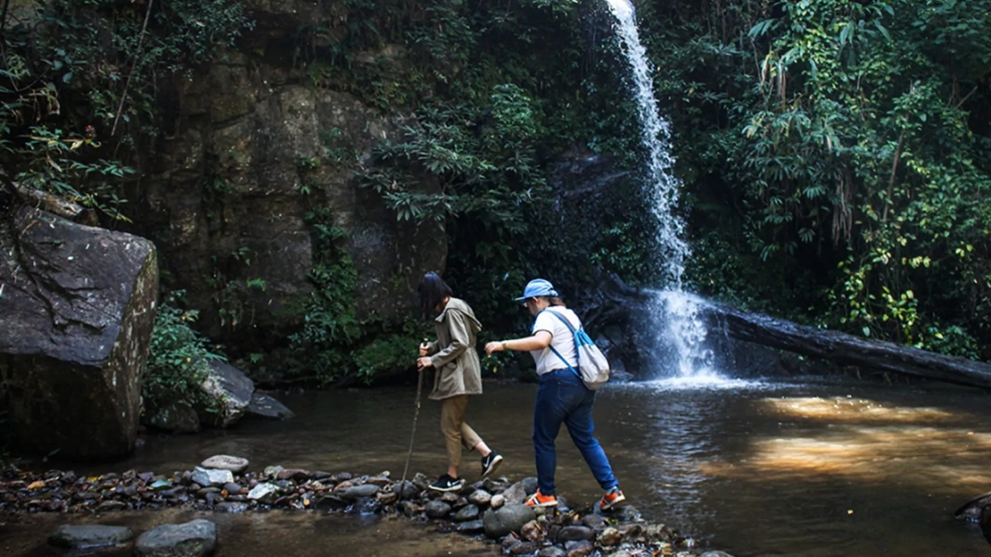 Le chemin vers la cascade Monthathan (6-8 km aller-retour, niveau modéré) traverse jungle et bambouseraies avant d’atteindre une chute d’eau rafraîchissante.