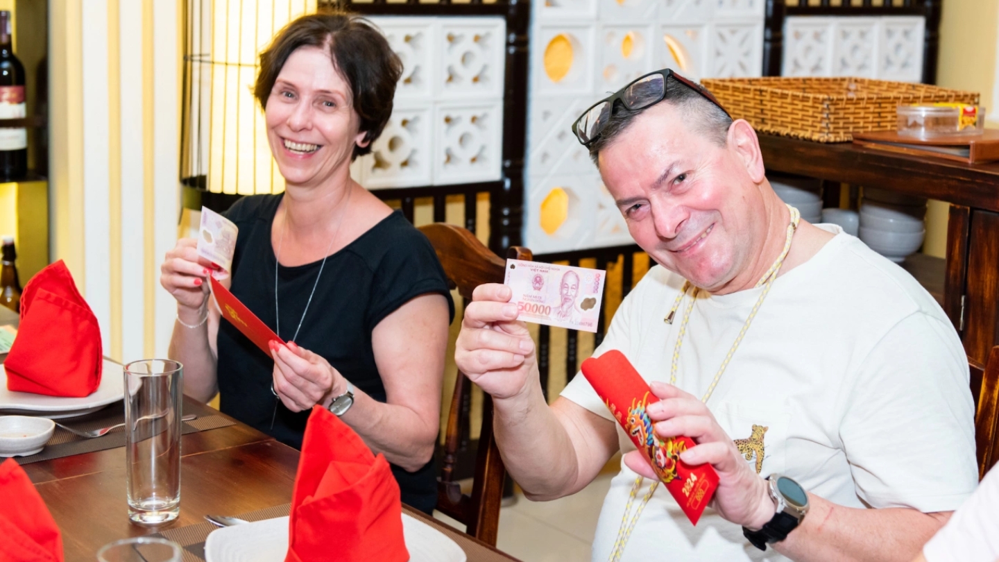 Mùng Một (1er jour - 17 février 2026) : c’est le jour le plus important de la fête. Il est réservé à la famille proche. Une coutume essentielle de la fête du Têt au Vietnam est le Xông Đất, qui désigne la première personne entrant dans une maison au Nouvel An. On choisit une personne joyeuse et gentille, car elle est censée apporter la chance pour l’année. Les enfants reçoivent des enveloppes rouges Lì Xì avec de l’argent neuf pour leur souhaiter bonheur et santé. Ce jour-là, on ne balaie pas la maison pour ne pas perdre la bonne fortune.