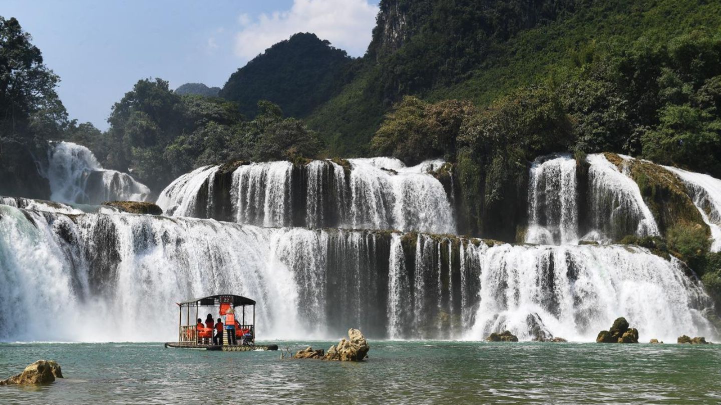Pour le troisième jour de 1 semaine à Cao Bang, inutile de partir à l’aube : 8h30 est une excellente heure de départ. La route vers Ban Gioc dure environ 1 h 30, avec des arrêts occasionnels pour photographier les rizières. Lorsque vous arrivez face à la cascade - partagée entre le Vietnam et la Chine - vous ressentez un souffle puissant. L’eau se déverse sur plusieurs étages, créant des embruns qui humidifient vos vêtements.
