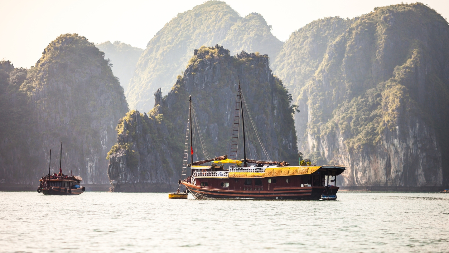 La jonque traditionnelle : Ce navire reste le moyen privilégié pour visiter la baie d'Halong en profitant des paysages karstiques. Les bateaux assurent le transport entre les sites majeurs.