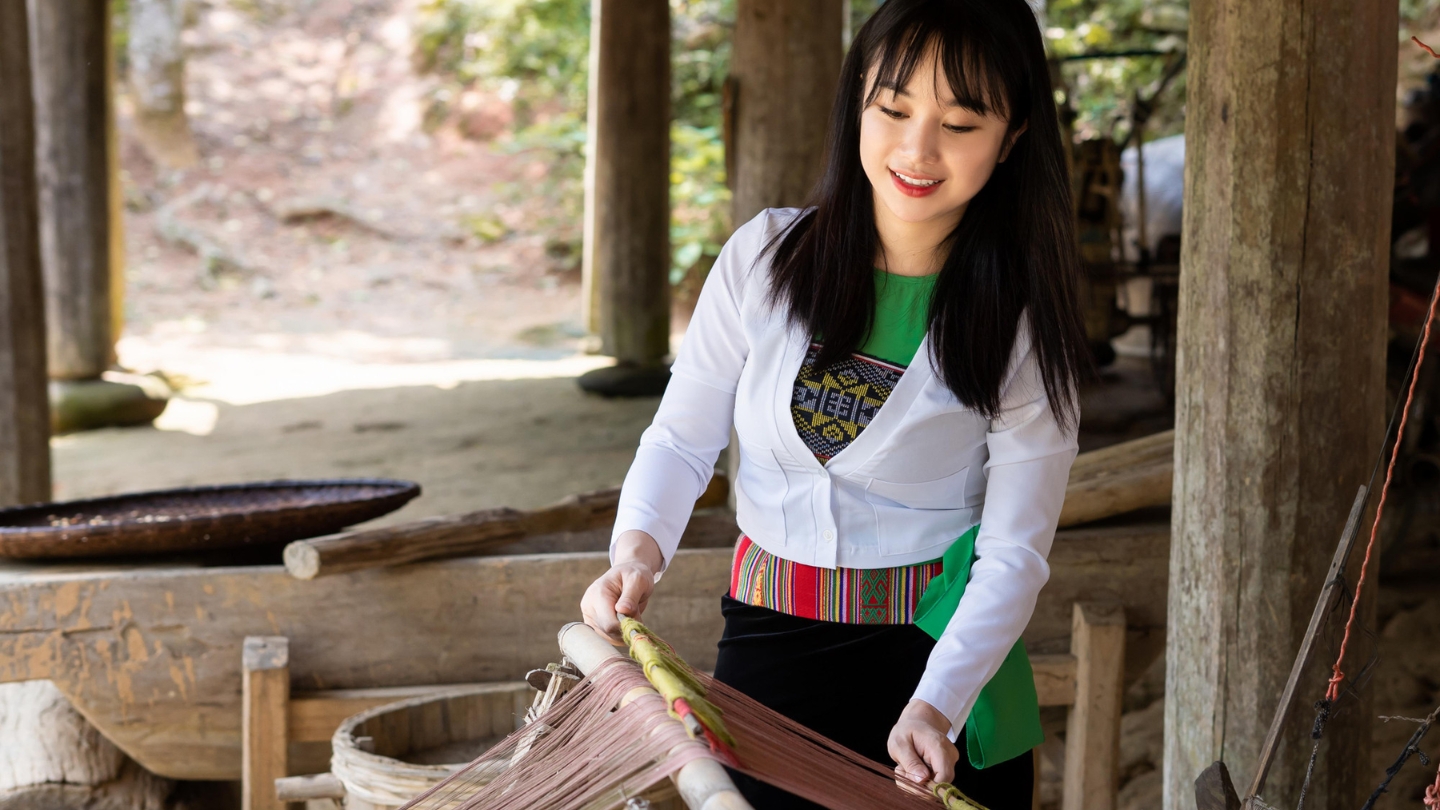 La tenue féminine se distingue par une plus grande richesse visuelle. Le couvre chef correspond à une pièce de tissu blanc rectangulaire sans broderie. Le haut, souvent blanc, arrive à la taille, présente une ouverture sur la poitrine, porté avec un plastron brodé multicolore. La jupe longue, noire ou bleu foncé, épouse la silhouette, ornée d’une ceinture décorative inspirée de l’art Dong Son.