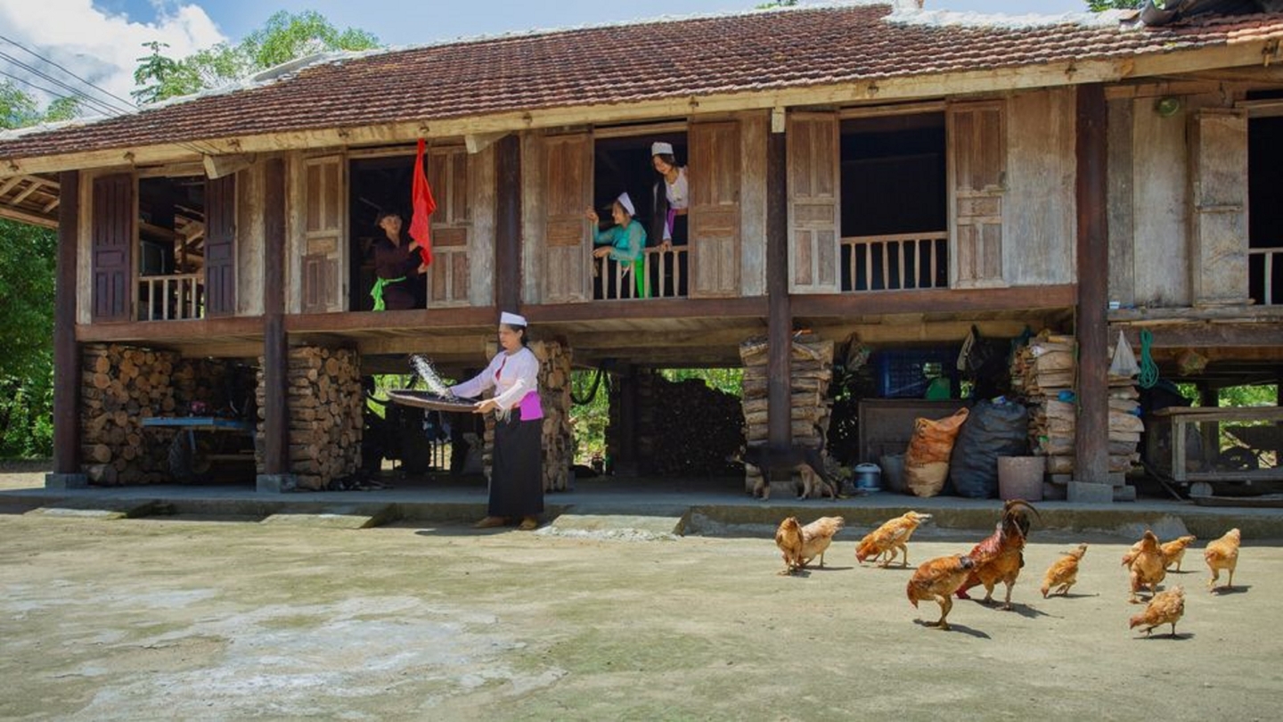 Le peuple Muong Vietnam vit dans des maisons sur pilotis en bois à quatre toits, souvent entourées de rangées de palmiers, d’arbres à jacquier. Ce type d’habitat reflète le mode de vie rural de l’ethnie Muong Vietnam, étroitement lié à l’environnement naturel des régions de moyenne montagne.