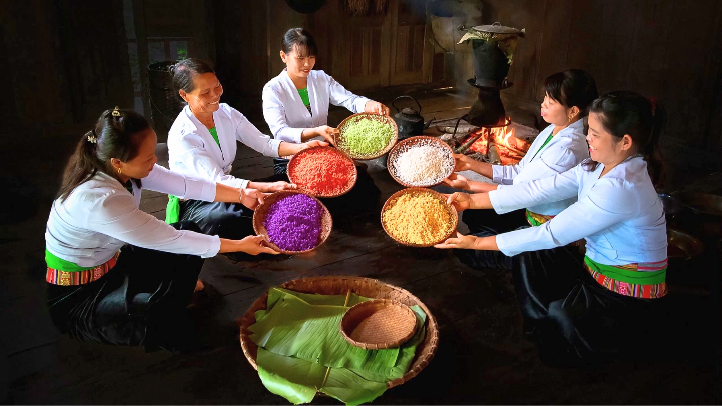 Le riz gluant aux cinq couleurs symbolise la cosmologie du peuple Muong Vietnam. Les teintes vives proviennent exclusivement de plantes locales infusées dans les grains avant la cuisson à la vapeur. Ce mets visuel accompagne les célébrations importantes marquant le calendrier spirituel montagnard.
