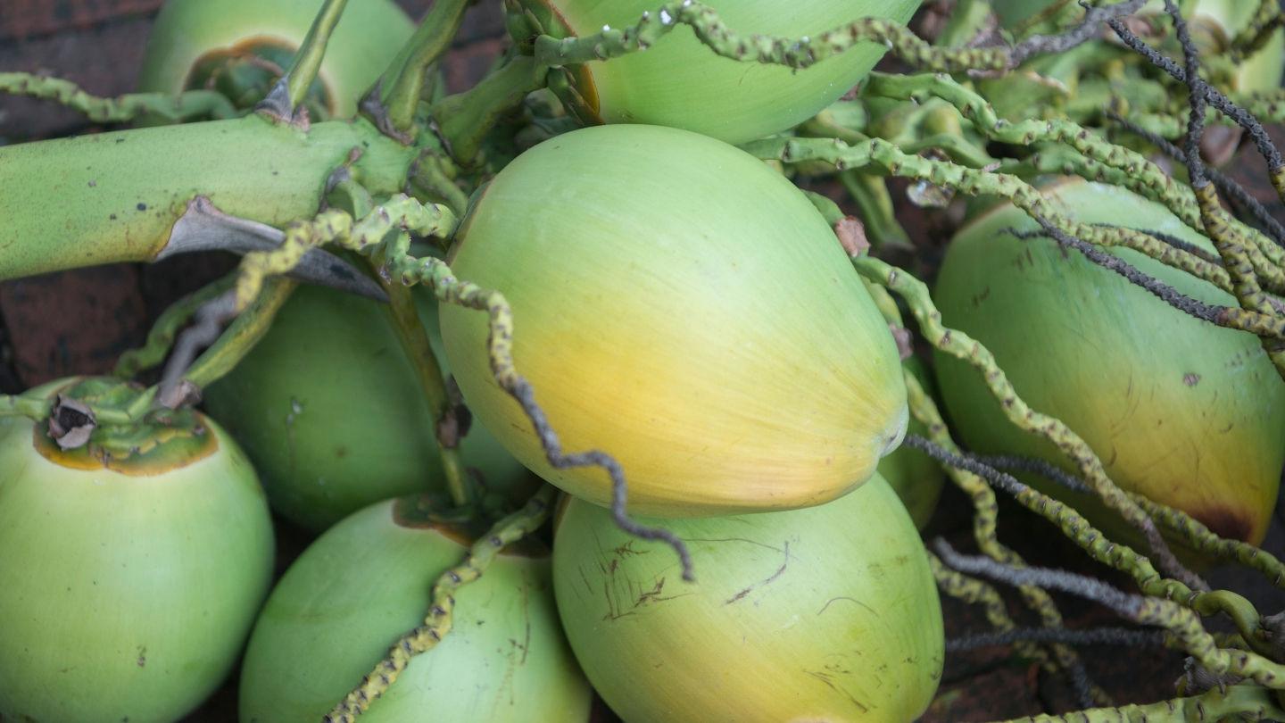 La noix de coco pousse en abondance dans les régions basses du Laos, notamment le long du Mékong et dans les provinces méridionales comme Champasak. On la trouve toute l'année, ce qui en fait l'un des fruits Laos les plus accessibles quelle que soit la période du voyage.