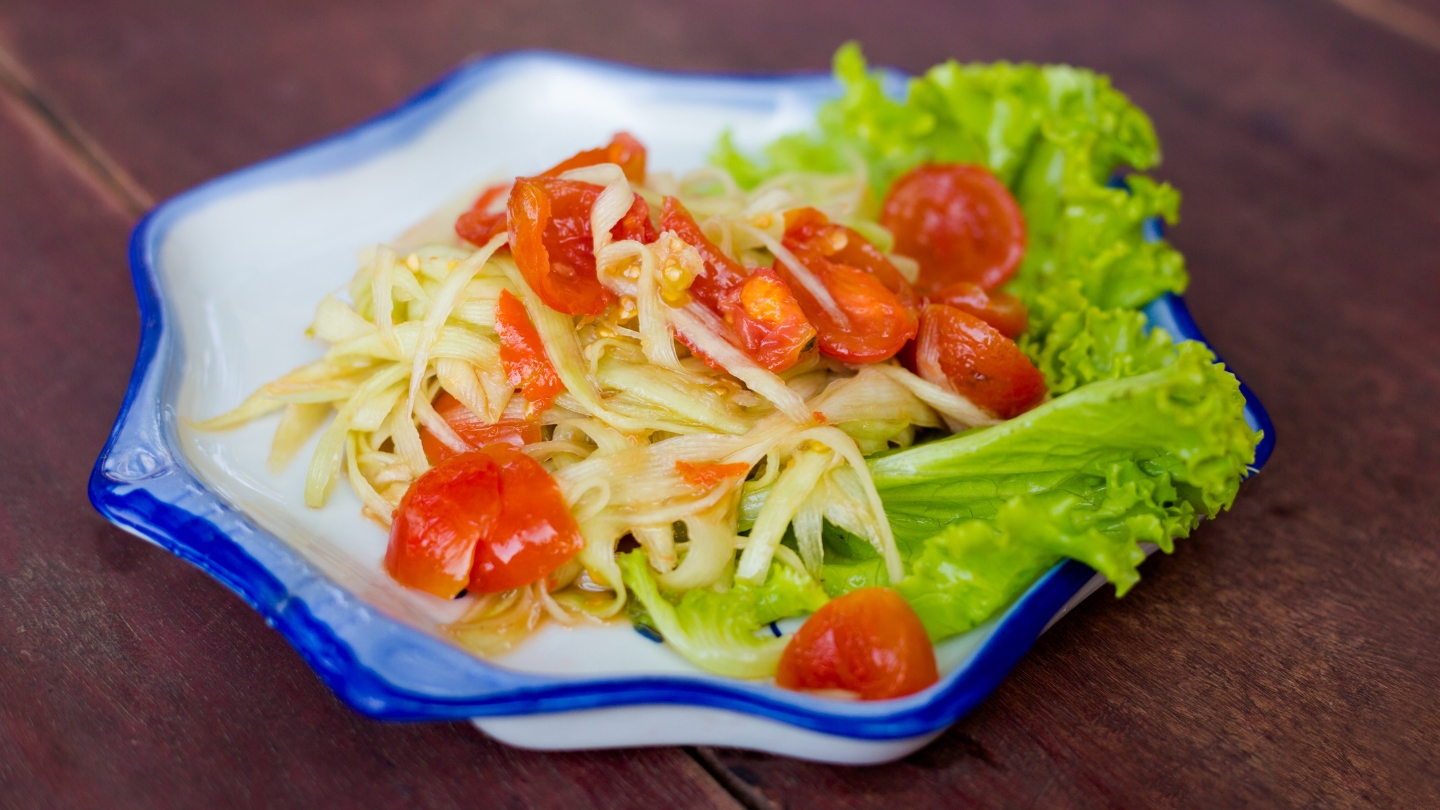 Le Tam Mak Houng est probablement la préparation la plus emblématique à base de fruits du Laos. La papaye verte est pilée dans un mortier avec de l'ail, du piment, de la sauce de poisson et du citron vert, donnant une salade fraîche, acidulée et relevée. Ce plat se trouve sur absolument tous les marchés et restaurants locaux du pays, du nord au sud. Pour les Laotiens, c'est un incontournable du quotidien, souvent servi en accompagnement du riz gluant à chaque repas.
