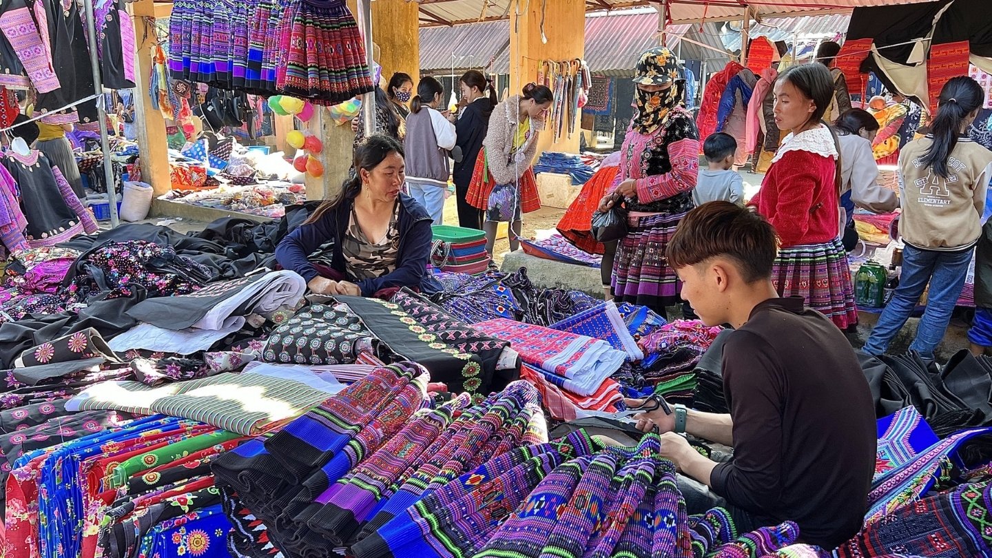 Votre dernière matinée de cet itinéraire 3 jours à Mai Chau commence par une ascension vers les hauts plateaux, à environ 30 km du centre, pour atteindre le marché local de Pa Co. Si vous vous demandez encore que faire à Mai Chau pour vivre une expérience authentique, ce carrefour culturel perché à plus de 1000 mètres d'altitude est une étape incontournable. Véritable explosion de couleurs et de vie où se rencontrent les ethnies H’mong Fleur, Thaï et Muong, ce marché hebdomadaire illustre parfaitement la diversité de ce que l'on peut faire à Mai Chau en 3 jours. En déambulant entre les étals, vous serez ébloui par la finesse des costumes traditionnels et l'artisanat local, des batiks à la cire d’abeille aux bijoux en argent martelé. C’est une immersion brute et sensorielle, offrant un aperçu fascinant de l'âme du Nord-Vietnam avant de clore votre périple.