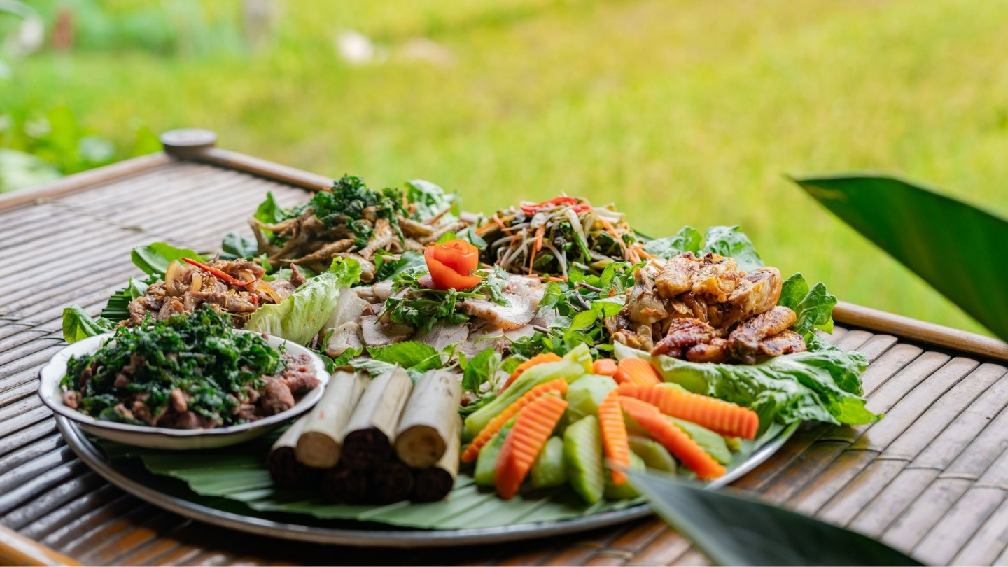 Dès votre arrivée dans la vallée, dirigez-vous vers le restaurant Hoa Ban Mai Chau. C'est une adresse incontournable pour une première immersion gustative. Construit dans le style traditionnel des ethnies Thaï, ce restaurant offre une ambiance chaleureuse et spacieuse, idéale pour se reposer après la route. Laissez-vous tenter par le porc sauvage grillé, le poisson de rivière cuit dans des feuilles de bananier, ou encore le poulet de colline aux herbes locales. Ne manquez pas le célèbre Cơm lam (riz gluant cuit dans des tubes de bambou), une spécialité parfumée qui accompagne merveilleusement chaque plat.